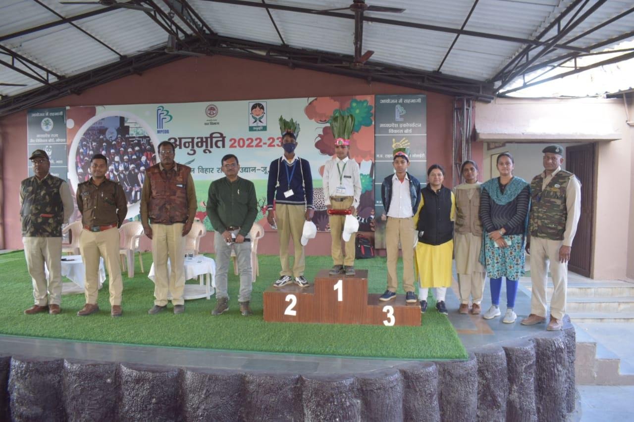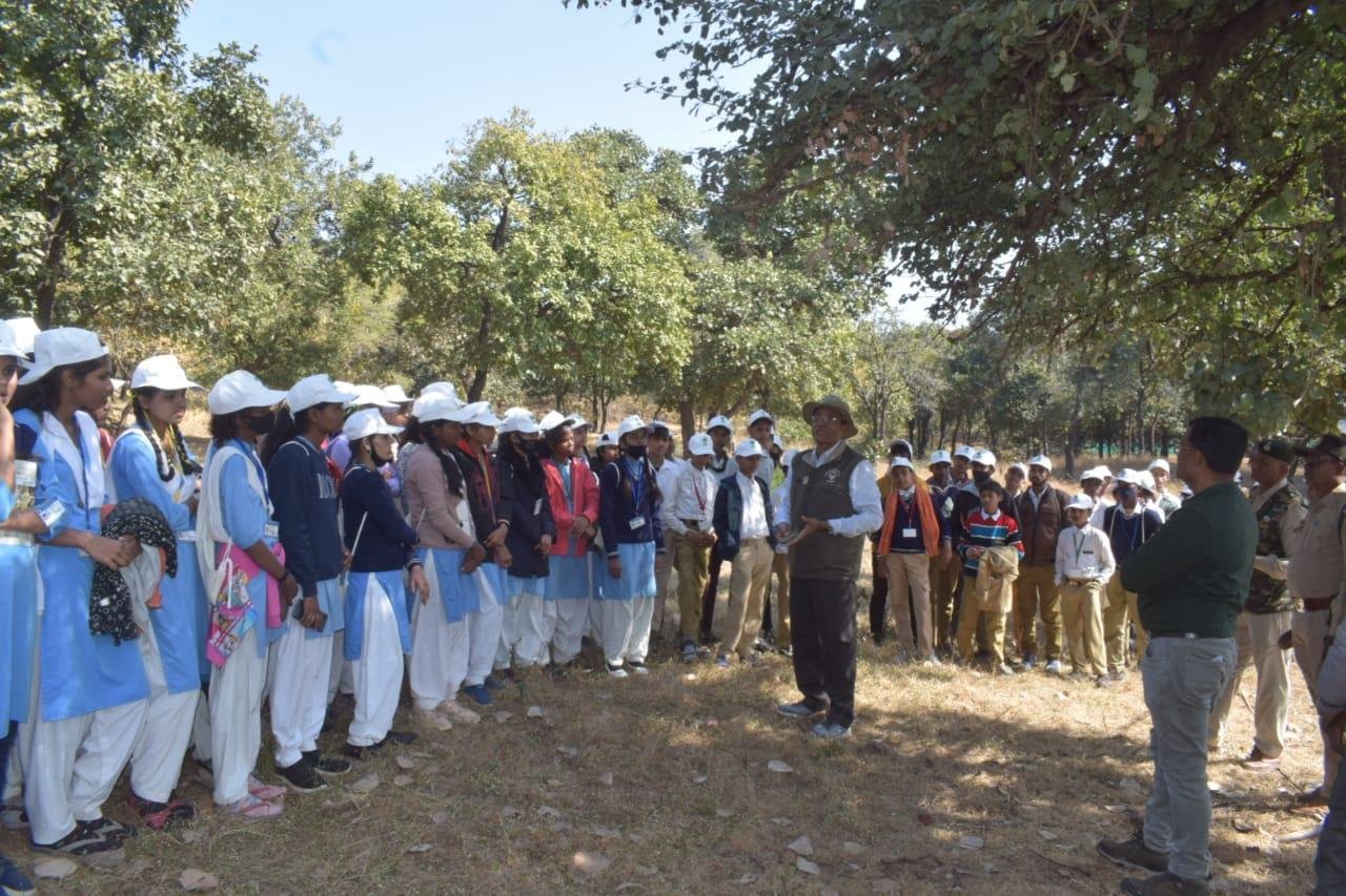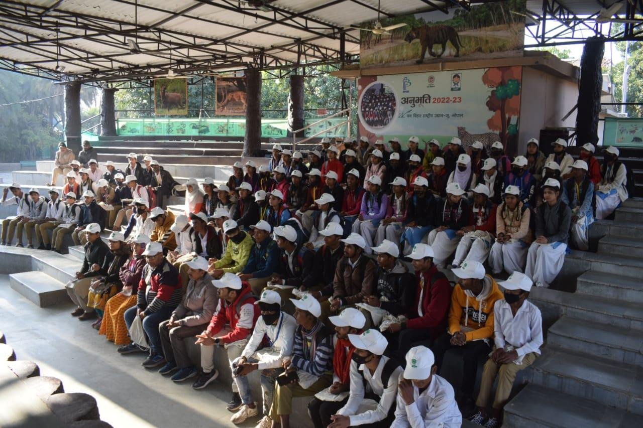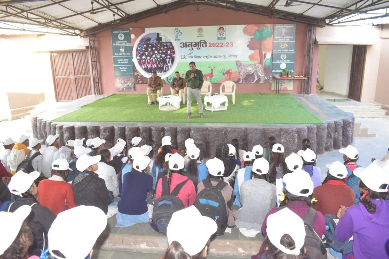 मध्यप्रदेश शासन वन विभाग द्वारा अनुभूति कार्यक्रम 2022-23 के अंतर्गत वन, वन्यप्राणी एवं पर्यावरण संरक्षण के प्रति संवेदनशीलता विकसित करने के उद्देश्य से मध्यप्रदेश ईको पर्यटन विकास बोर्ड के समन्वय से आयोजित प्रशिक्षण सह जागरूकता शिविर के अंतर्गत वन विहार राष्ट्रीय उद्यान में आज दिनांक 12.01.2023 को चतुर्थ शिविर आयोजित किया गया, जिसमें शासकीय नवीन हाई स्कूल बैरागढ़ चीचली के कुल 88 विद्यार्थियों ने भाग लिया। उक्त शिविर के आयोजन के प्रमुख उद्देश्य हैः- विद्यालयों के विद्यार्थियों अर्थात् भविष्य के नागरिकों को वन, वन्यप्राणी एवं पर्यावारण की अनुभूति कराकर, उन्हें उनके संरक्षण हेतु जागरूक एवं प्रेरित करना, विभाग एवं विभागीय अधिकारियों के कार्यो, उत्तरदायित्वों एवं चुनौतियों से विद्यार्थियों को अवगत कराना तथा माननीय प्रधानमंत्री जी द्वारा Mission LiFE "Lifestyle for Environment" के मूल मंत्रों से विद्यार्थियों को अवगत कराना ।
