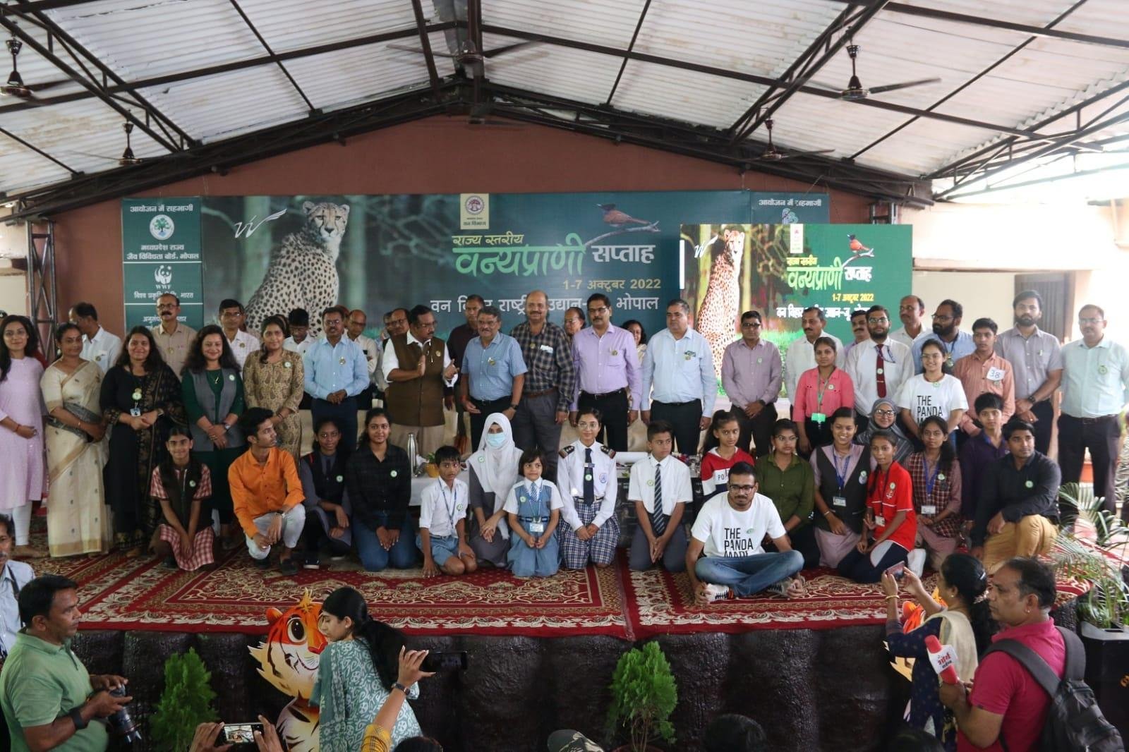 आज दिनांक 07 अक्टूबर को राज्य स्तरीय वन्यप्राणी सप्ताह 2022 का समापन एवं पुरस्कार वितरण समारोह वन विहार राष्ट्रीय उद्यान-जू भोपाल में डॉ. कुॅवर विजय शाह जी, मान्नीय मंत्री, वन, मध्य प्रदेश शासन के मुख्य आतिथ्य में आयोजित किया गया। मुख्य अतिथि द्वारा कार्यक्रम में उपस्थित विद्यार्थियों तथा अधिकारियों/कर्मचारियों को वन्यप्राणी संरक्षण की शपथ दिलाई। इस अवसर पर श्री अशोक बर्णवाल, प्रमुख सचिव, वन, म.प्र. शासन, डॉ. अभय कुमार पाटिल, प्रबंध संचालक, वन विकास निगम, श्री सी.के.पाटिल, प्रधान मुख्य वन संरक्षक (संरक्षण), श्री पुष्कर सिंह, प्रबंध संचालक, लघुवनोपज संघ, श्री अतुल कुमार जैन, प्रधान मुख्य वन संरक्षक (अनु.वि. एवं लो.वा.), श्री असीम श्रीवास्तव, प्रधान मुख्य वन संरक्षक (उत्पादन), श्री चितरंजन त्यागी, प्रधान मुख्य वन सरंक्षक (विकास), डॉं. अतुल श्रीवास्तव,प्रधान मुख्य वन संरक्षक (कार्य आयो. एवं भू अभि.), श्री राकेश कुमार यादव, प्रधान मुख्य वन सरंक्षक (प्रशासन-1), श्री पी.के.सिंह, प्रधान मुख्य वन संरक्षक (मानव संसाधन विकास), श्रीमती संगीता सक्सेना, संचालक विश्व प्रकृति निधि भारत, श्री एस.पी.शर्मा, अपर प्रधान मुख्य वन संरक्षक (समन्वय),   डॉ. यू.के. सुबुद्धि, संचालक, म.प्र. राज्य बांस मिशन, श्री सत्यानंद, अपर प्रधान मुख्य वन संरक्षक (वन्यप्राणी), श्रीमती समिता राजोरा, मुख्य कार्यपालन अधिकारी  म.प्र. ईको पर्यटन विकास बोर्ड, श्रीमती कमलिका मोहंता, अपर प्रधान मुख्य वन संरक्षक, कार्य आयोजना आंचलिक भोपाल, श्री एच.एस.मोहंता, अपर प्रधान मुख्य  वन संरक्षक (प्रशासन-2), श्रीमती पदमप्रिया बालाकृष्णन, संचालक वन विहार राष्ट्रीय उद्यान, डॉ. सुरेन्द्र तिवारी, सदस्य, म.प्र. राज्य वन्यप्राणी बोर्ड, श्री अशोक कुमार, अपर सचिव वन, श्री राजेश खरे, वन संरक्षक भोपाल वृत्त भोपाल, श्रीमती राखी नंदा, वनसंरक्षक सामाजिक वानिकी वृत्त भोपाल, श्री आलोक पाठक, वनमंडलाधिकारी, वन मंडल भोपाल, श्री एस.के.सिन्हा, सहायक संचालक वन विहार एवं अन्य वरिष्ठ अधिकारी तथा सेवा निवृत्त वन अधिकारी तथा बड़ी संख्या में शालाओं के शिक्षक, विद्यार्थीगण, अभिभावक एवं मीडियाकर्मी भी उपस्थित रहे। कार्यक्रम का मंच संचालन श्री ए.के.खरे, सेवा निवृत, उप वन संरक्षक द्वारा किया गया।