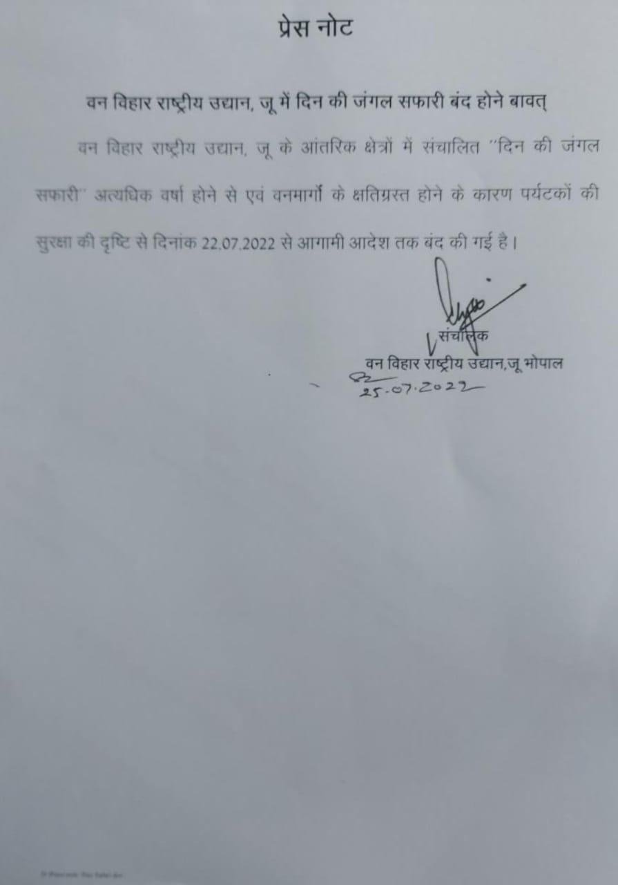 Jungle Safari of the day" operating in the interior areas of Van Vihar National Park & Zoo has been closed from 22.07.2022 till further orders due to excessive rainfall and damage to forest roads keeping safety of tourists on priority.