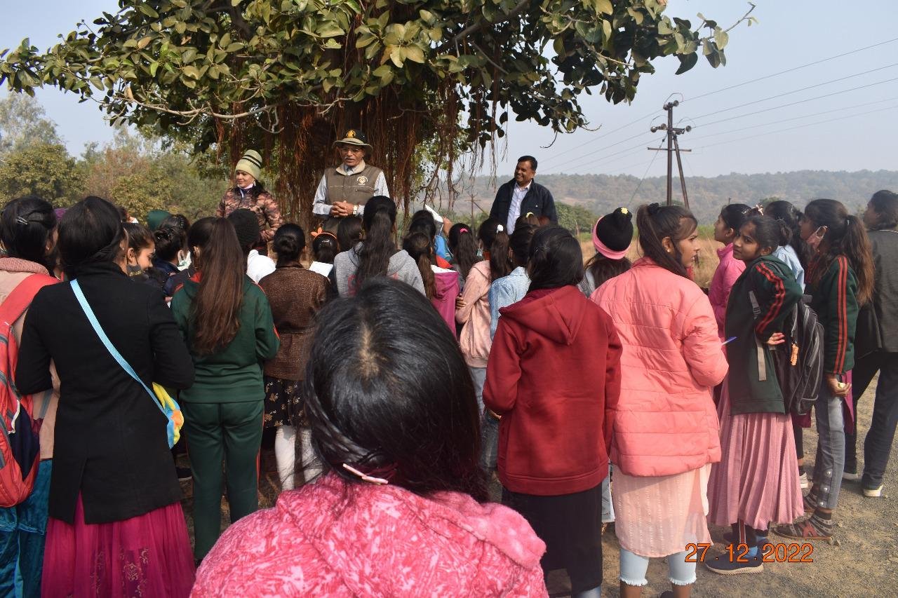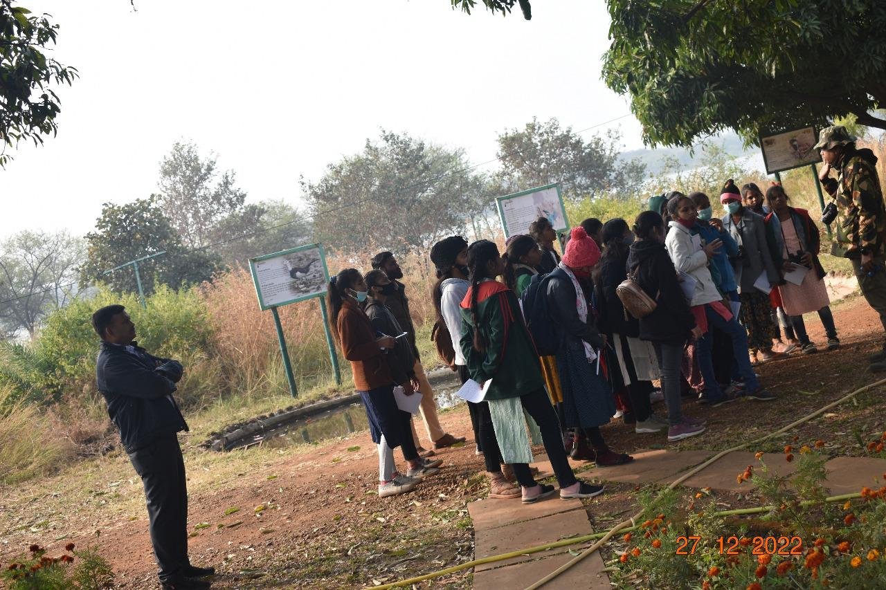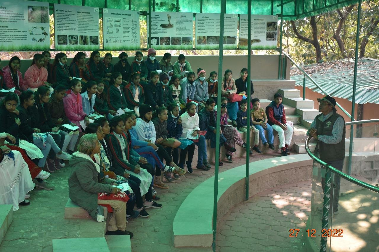 वन विहार राष्ट्रीय उद्यान, जू भोपाल में छात्र - छात्राओं में वन, वन्यप्राणियों एवं पर्यावरण के प्रति जागरूकता तथा प्रकृति संरक्षण के प्रति संवेदनशीलता विकसित करने की दृष्टि से भोपाल शहर एवं उसके आस-पास के ग्रामों के शासकीय विद्यालयों के विद्यार्थियों के लिये एक दिवसीय नेचर कैम्प आयोजित किये जा रहे हैं। इसी क्रम में आज दिनांक 27.12.2022 को शासकीय नवीन कन्या उच्चतर माध्यमिक विद्यालय तुलसी नगर के 54 विद्यार्थियों ने उक्त नेचर कैम्प में भाग लिया। कार्यक्रम में स्रोत व्यक्ति रूप में श्री ए. के. खरे, सेवा निवृत उप वन संरक्षक तथा पक्षीविद के रूप में डॉ. संगीता राजगीर तथा मो. खालिक भोपाल बर्ड्स भोपाल उपस्थित रहे । विषय विशेषज्ञों द्वारा प्रतिभागियों को पक्षी दर्शन, वन्यप्राणी दर्शन, फिल्म शो, स्थल पर विद्यमान वानिकी गतिविधियों की जानकारी, वन, वन्यप्राणी व पर्यावरण से संबंधित रोचक गतिविधियॉ कराई गई एवं जानकारी प्रदान कर उनकी जिज्ञासाओं को शांत किया गया। भ्रमण के दौरान प्रतिभागियों ने विभिन्न प्रजातियों का दर्शन किये जिसमें प्रमुख है ग्रीन बी ईटर, टिटहरी, पोंड हेरोन, रेड मुनिया, इग्रेट, मेग पाई राबिन, मूरहैन, ड्रोंगो, ब्रोंज विंग जकाना, किंगफिशर, विहिस्लिंग टील्सकार्मोरेंट, सिल्वर बिल मुनिया आदि । तितलियों में ब्लू टाईगर, क्रीमसन रोज, ग्रे पेनसी, प्लेन टाईगर, कॉमन ईवनिंग ब्राउन, कॉमन ग्रास यलो आदि को देखकर प्रतिभागी उत्साहित हो उठे। इसके अतिरिक्त बाघ, तेंदुआ, भालू, मगर, घड़ियाल, चीतल, सांभर, नीलगाय, सरीसर्प आदि वन्यप्राणियों का भी अवलोकन किया। इस दौरान संचालक वन विहार श्रीमती पदमप्रिया बालाकृष्णन एवं अन्य अधिकारी कर्मचारी भी उपस्थित रहे। कैम्प का संचालन सहायक संचालक वन विहार श्री सुनील कुमार सिन्हा द्वारा किया गया।