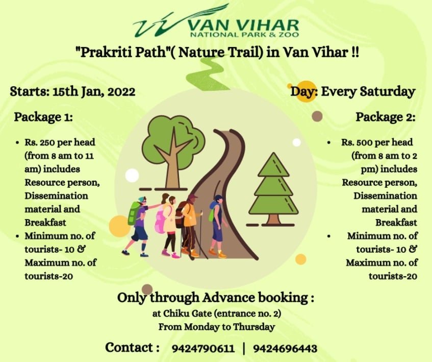 वन विहार राष्ट्रीय उद्यान एवं जू, भोपाल में दिनांक 07.01.2021 को राज्य स्तरीय वन्यप्राणी के समापन समारोह के समय प्रकृति पथ (नेचर ट्रेल) स्थापित करने का संकल्प लिया गया था ताकि प्रकृति प्रमियों एवं पर्यटकों को वन, वन्यजीव एवं पर्यावरण के विभिन्न घटकों से अवगत कराया जा सके। यह प्रकृति पथ दिनांक 15.01.2022 से वन विहार में आयोजित किया जाना प्रस्तावित है। इस पथ पर भ्रमण करने वाले पर्यटकों को अत्यंत आनंद के साथ - साथ वन, वन्यजीव एवं पर्यावरण के विषय में ज्ञानवर्धक जानकारी भी प्राप्त कर सकेगें। इस ट्रेल की कुल लंबाई 2.4 कि.मी. है एवं इसमें 20 बिंद / स्थल हैं । प्रकृति पथ भ्रमण (नेचर ट्रेल), रामसर साइट (बड़े तालाब) के अवलोकन से प्रारंभ होकर क्रमशः पक्षी व्याख्या केंद्र, तितली पार्क, सर्प बाड़ा के बाद प्राकृतिक पथ पर विभिन्न घटकों- दीमक की बामी, मिश्रित वन- घास का मैदान, वन्यप्राणियों के श्रृंगाभ- सींग-लेंडिया-पगमार्क-पंख-रहवास स्थल, बैलोइंग पोंड्स, बारासिंगा बाड़ा - तालाब एवं घड़ियाल- मगर बाड़ा तथा पक्षी विहार के दर्शन के साथ संपन्न होगी।